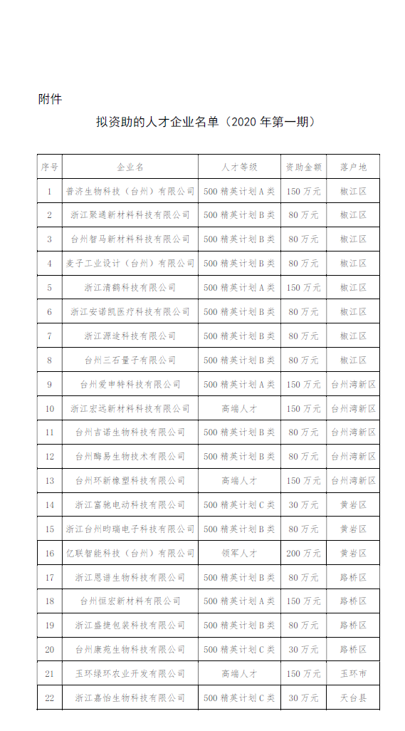 根據《臺州市“以資引才”引進人才團隊實施辦法》(臺人才領〔2020〕40 號)的規定,我市啟動了天使夢想基金資助申報工作。經企業自愿申報、評審委員會篩選、天使夢想基金管理委員會審議,擬對22家人才企業進行資助,現將名單予以公示。如有意見,可向市金投集團反映。