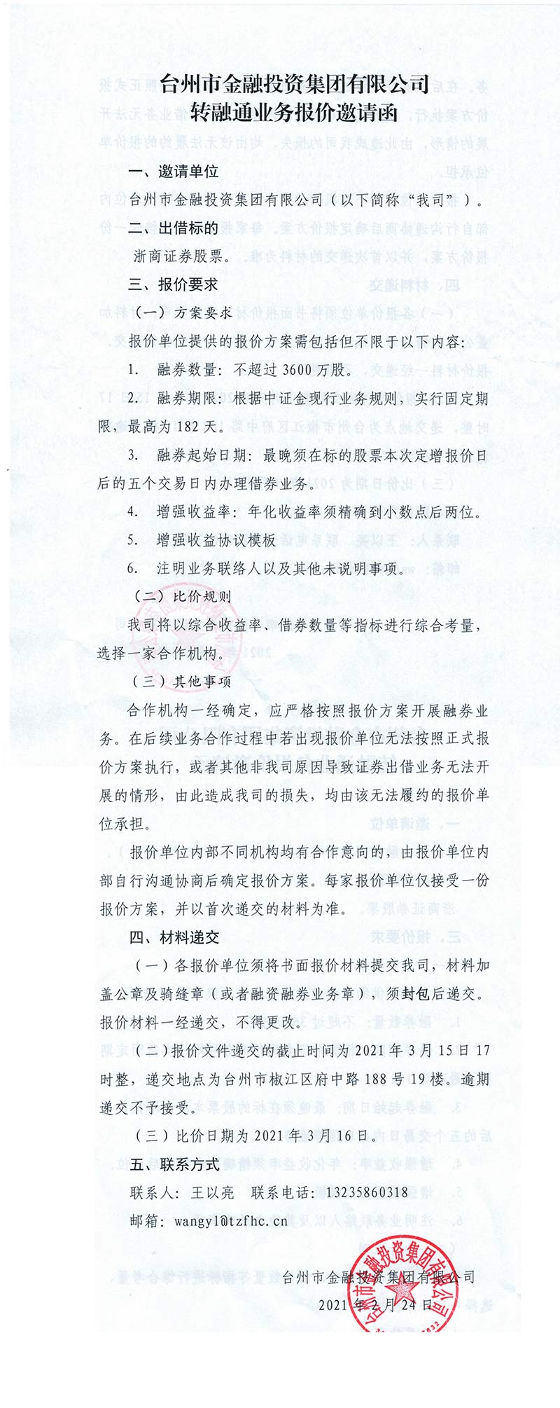 臺(tái)州市金融投資集團(tuán)轉(zhuǎn)融通業(yè)務(wù)報(bào)價(jià)邀請(qǐng)函(浙商證券股票報(bào)價(jià))