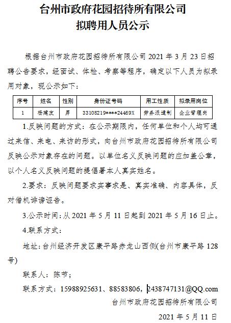 臺州市政府花園招待所有限公司擬聘用人員公示